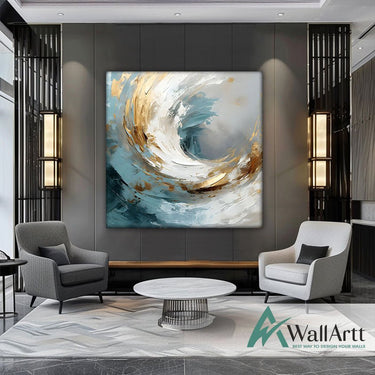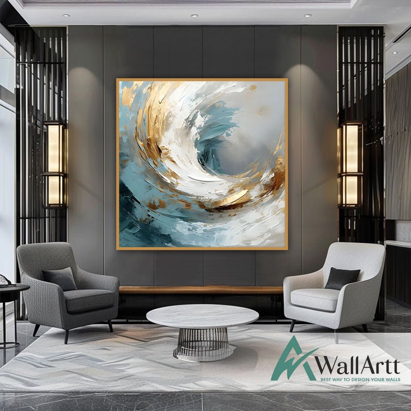 Stormlight Swirl is a bold abstract with a clean, modern feel—teal and soft whites with flashes of warmth that make it look expensive on the wall. It’s ideal for a living room, home office or entrance hall, especially above a sofa or sideboard with minimalist décor and warm lighting.