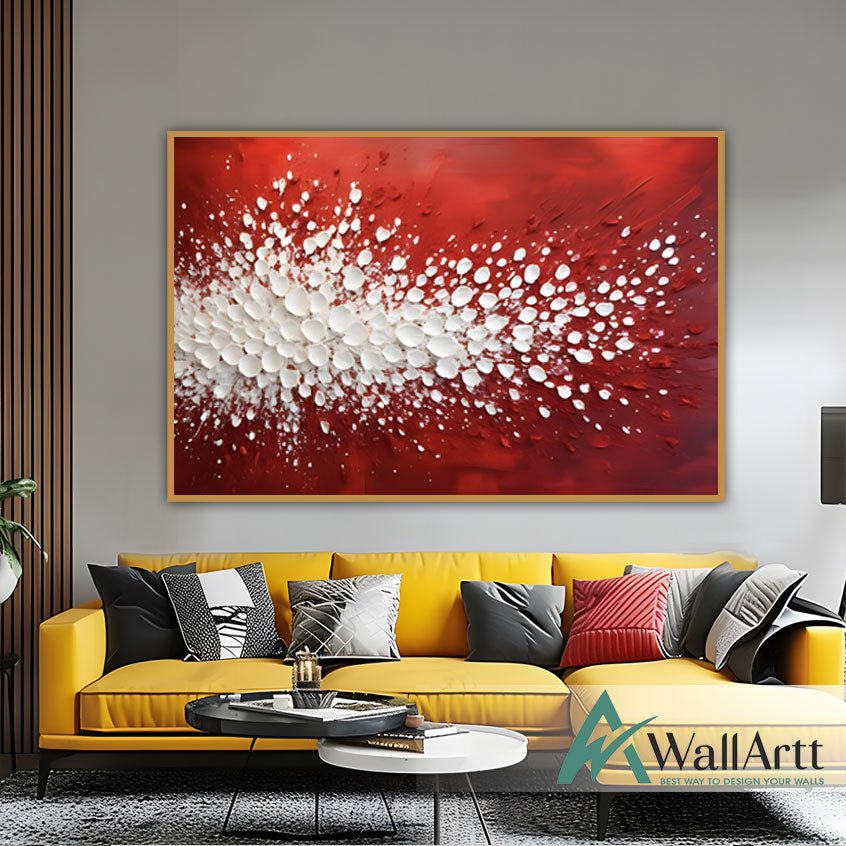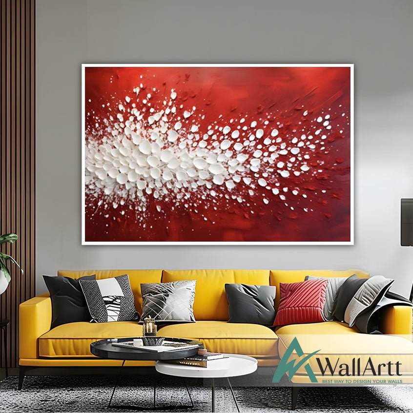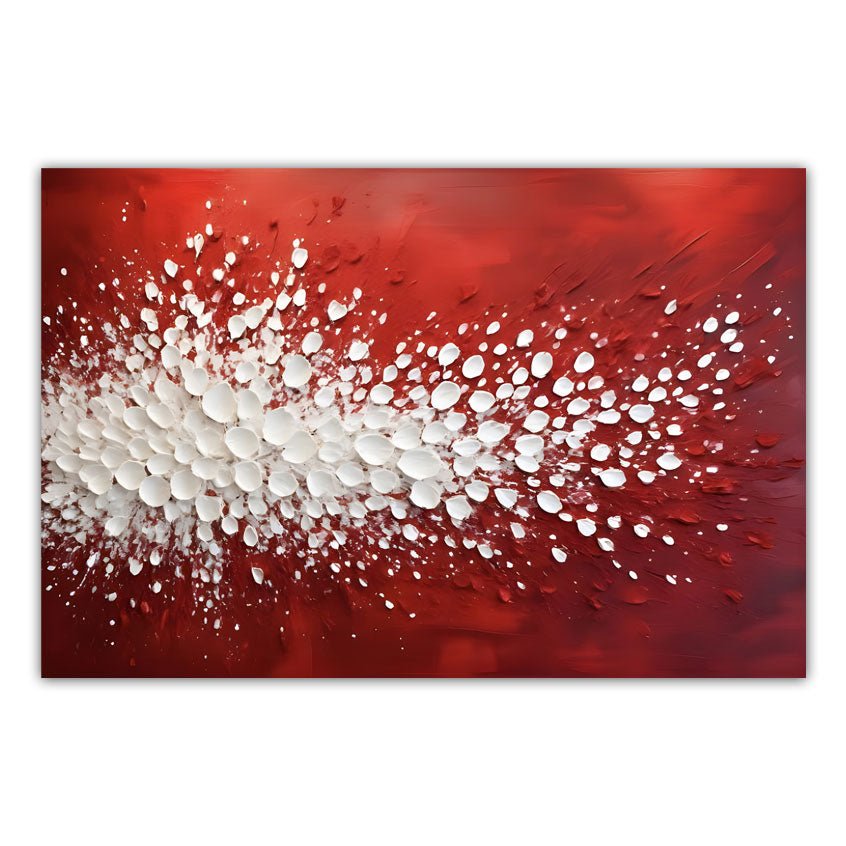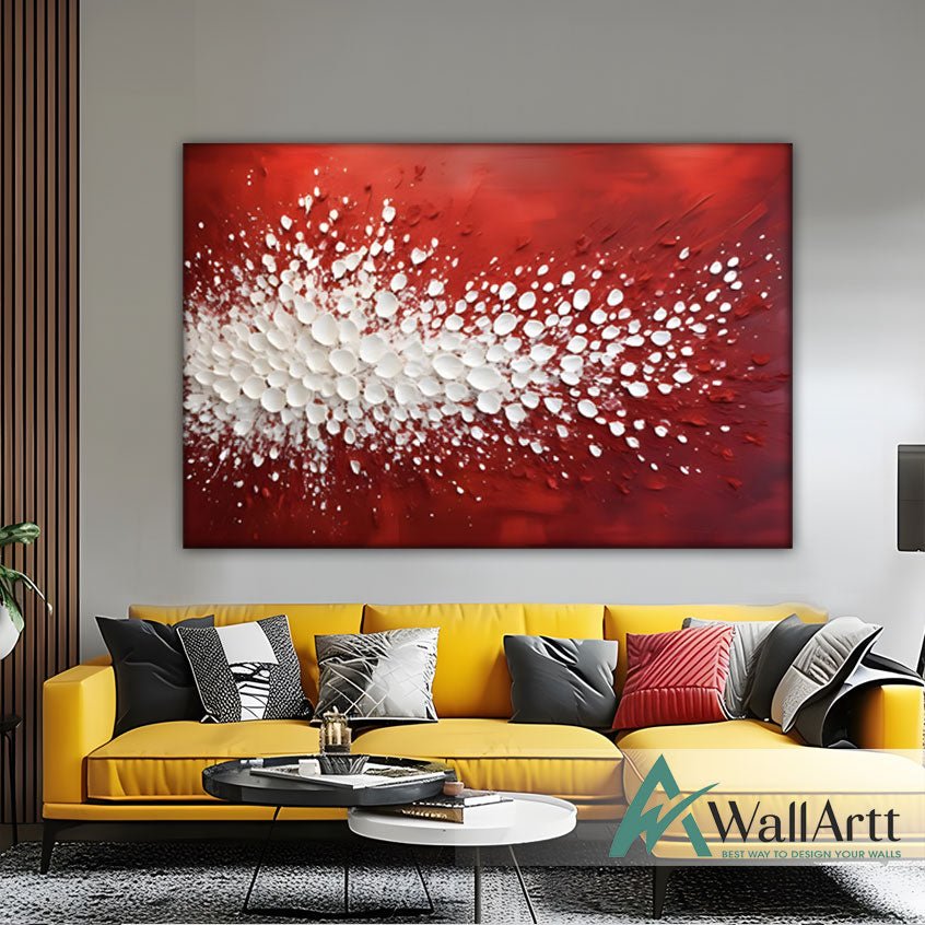 Make a bold statement with the White Particles on Crimson 3D Oil Painting. This striking piece features a deep crimson backdrop contrasted by hand-finished white textured "particles" that create a dramatic sense of depth and energy.