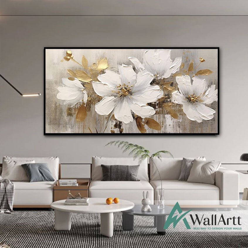 White Flowers with Gold Leaves IV 3d Heavy Textured Partial Oil Painting