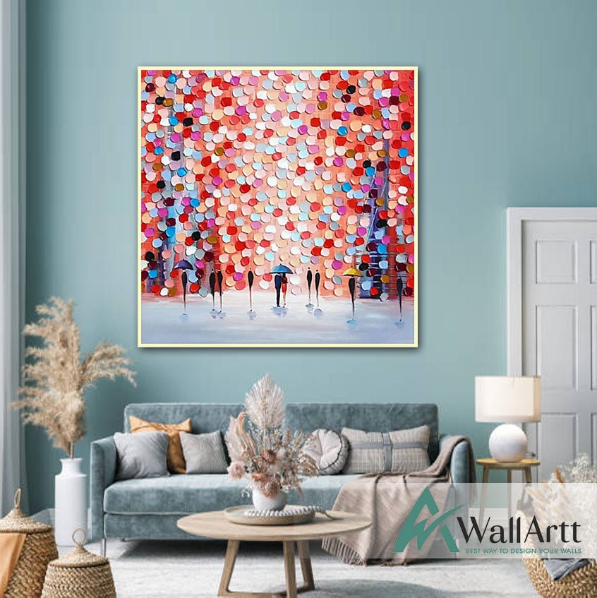 custom-made by our artists using spatulas(Palette Knife) and brushes according to your selected visual,dimensions, and frame on top of a printed canvas.