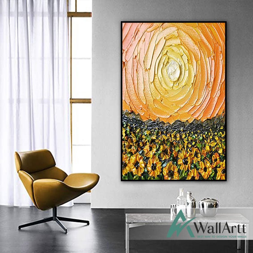 Orange Sun & Sunflowers 3d Heavy Textured Partial Oil Painting