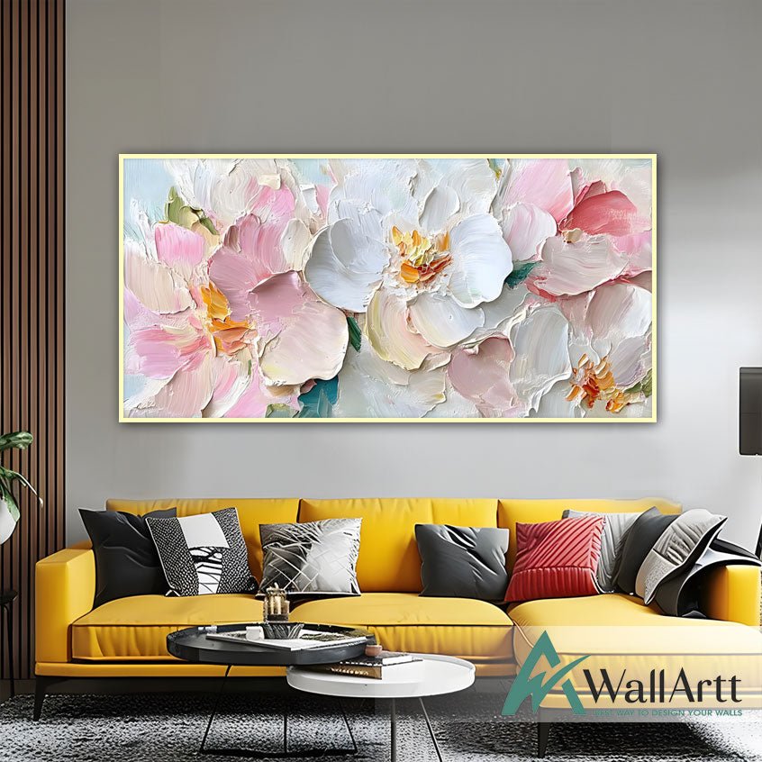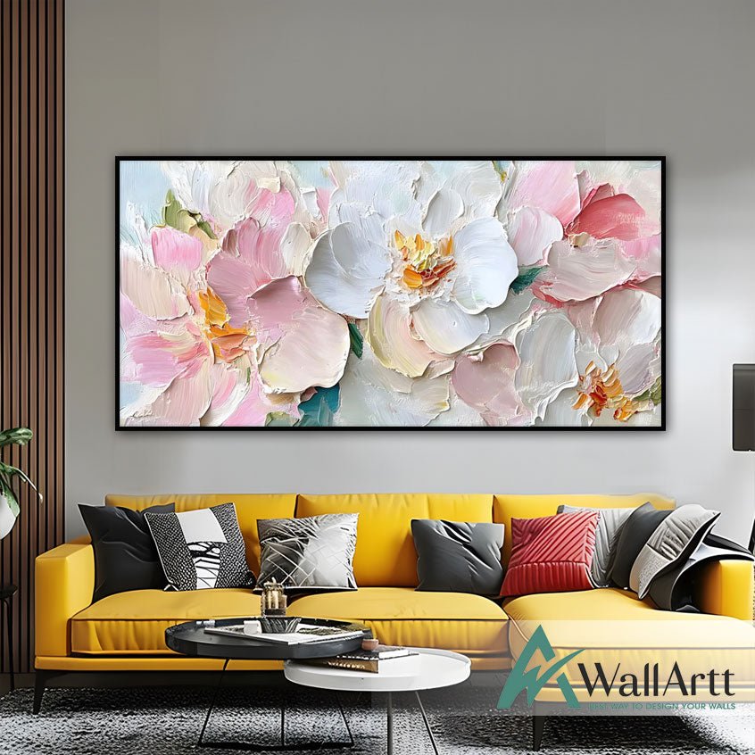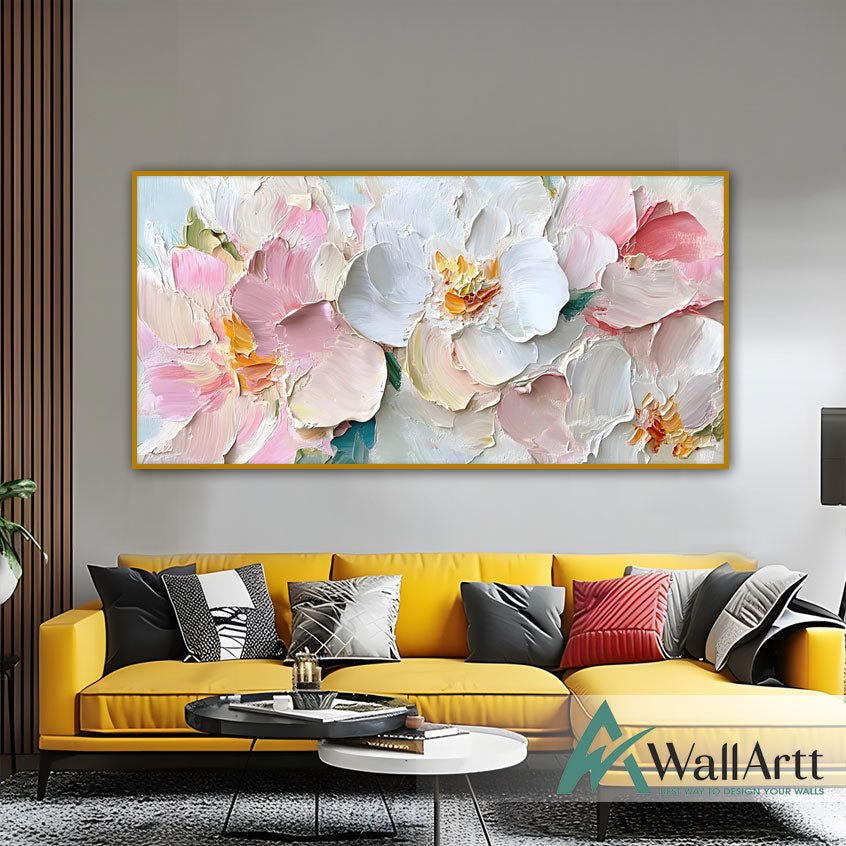 custom-made by our artists using spatulas(Palette Knife) and brushes according to your selected visual,dimensions, and frame on top of a printed canvas.