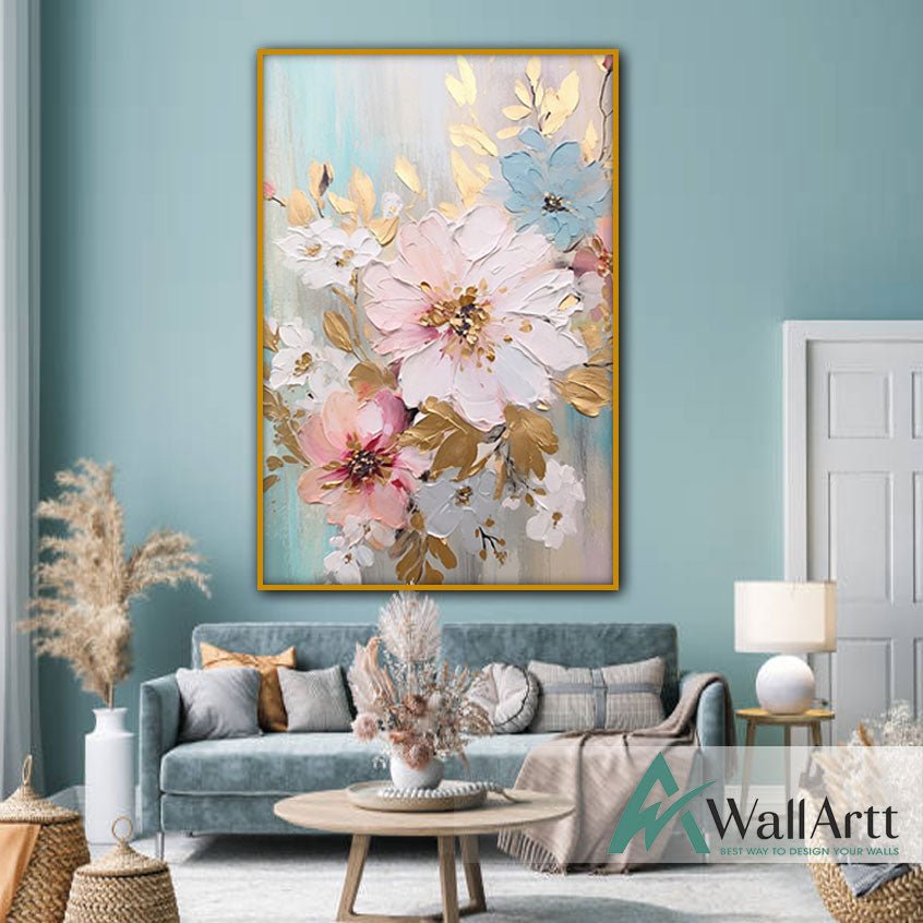 Flower with Gold Leaves 3d Heavy Textured Oil Painting