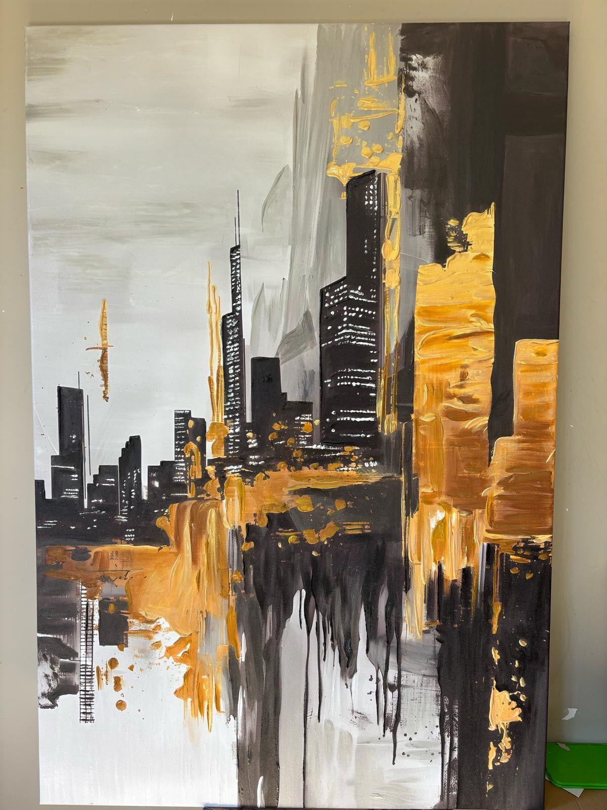 Gold Black Skyscrapers Textured Partial Oil Painting - Wall Art