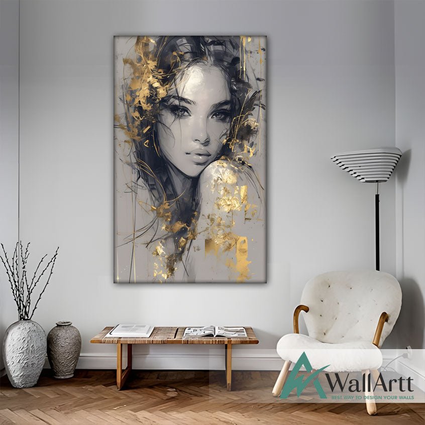 Gorgeous Woman with Gold Foil Textured Partial Oil Painting - Wall Art