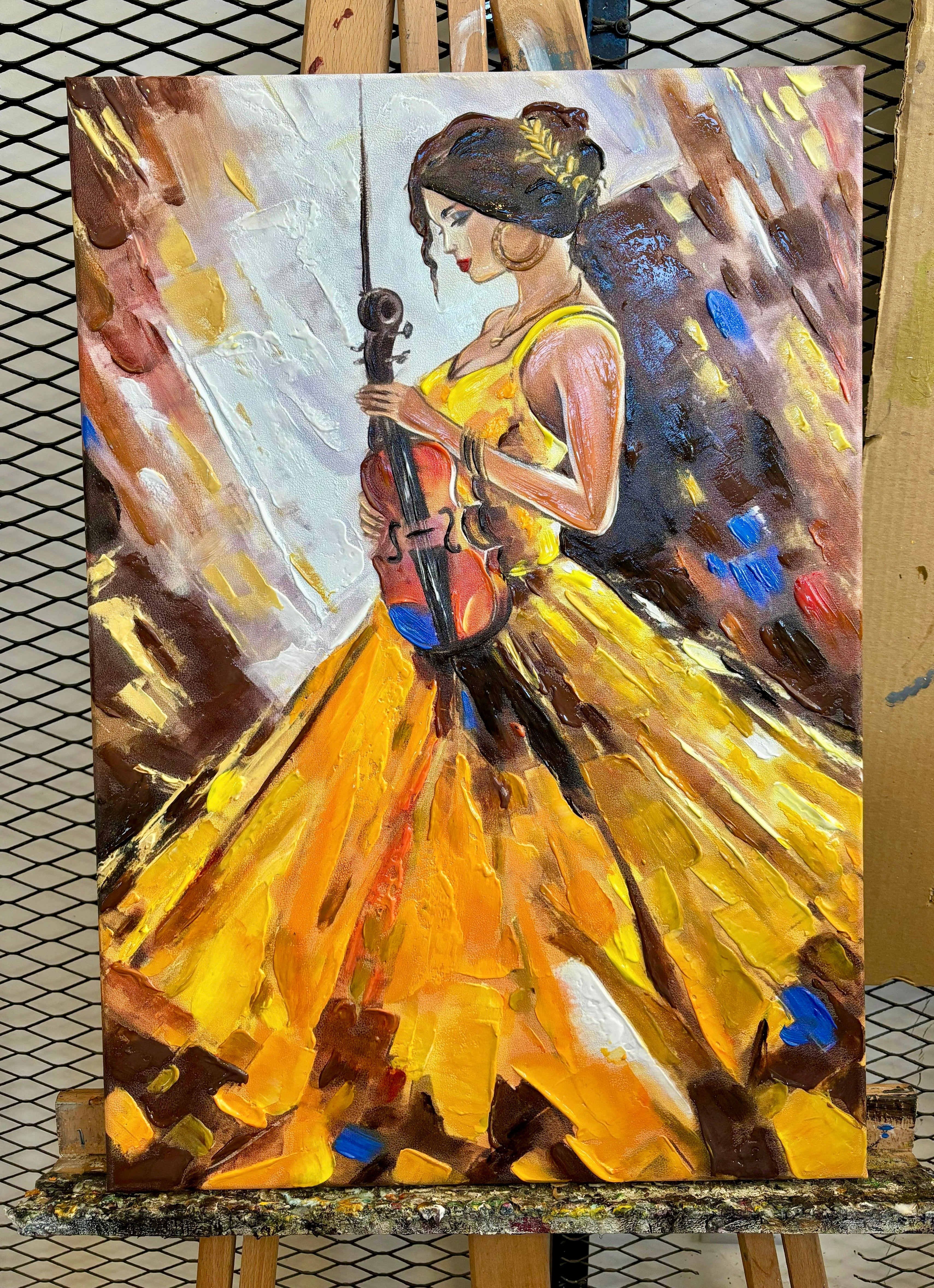 Violinist in an Orange Dress Textured Partial Oil Painting