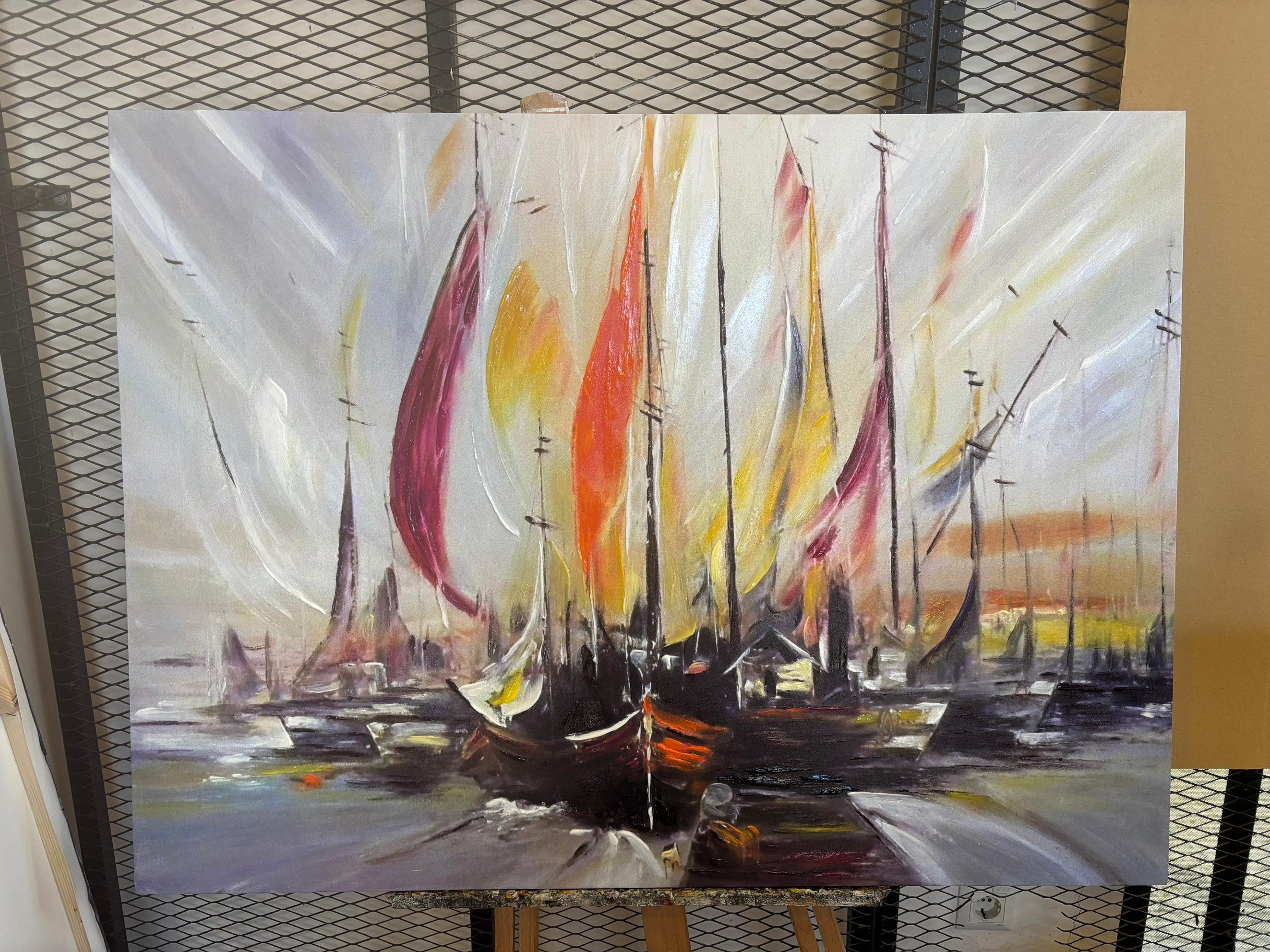 Red Orange Sailboats Textured Partial Oil Painting