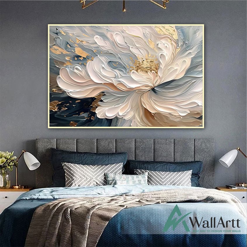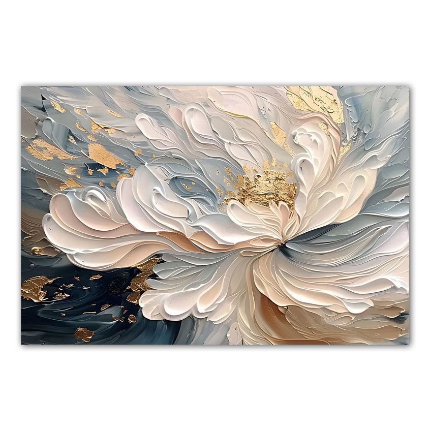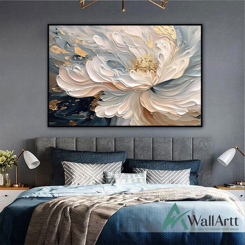 Abstract Gold White Flower 3D Heavy Textured Partial Oil Painting - Wall Art