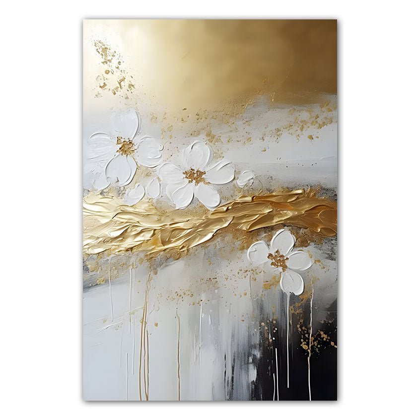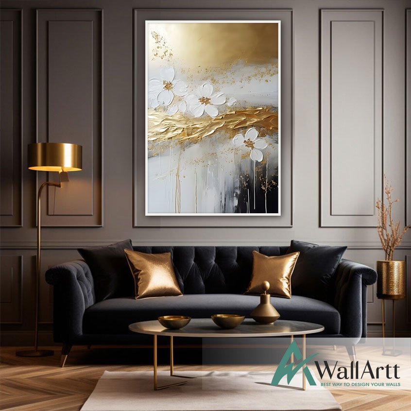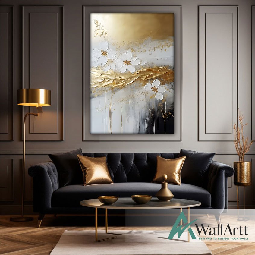 Abstract White Flowers with Gold II 3d Heavy Textured Partial Oil Painting - Wall Art