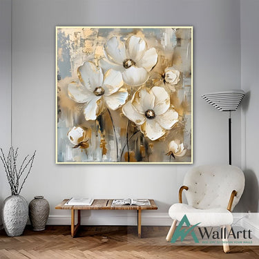 Bring soft elegance and a touch of luxury to your walls with this Cream Gold Foil Flowers 3D heavy textured oil painting. Delicate cream petals are highlighted with shimmering gold accents, creating a sophisticated floral composition that feels both modern and timeless. The gentle neutral tones make it an easy piece to style, while the metallic details add just the right amount of glamour.