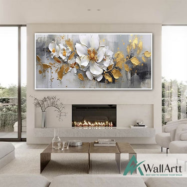 White Flower with Gold Leaves 3d Heavy Textured Partial Oil Painting